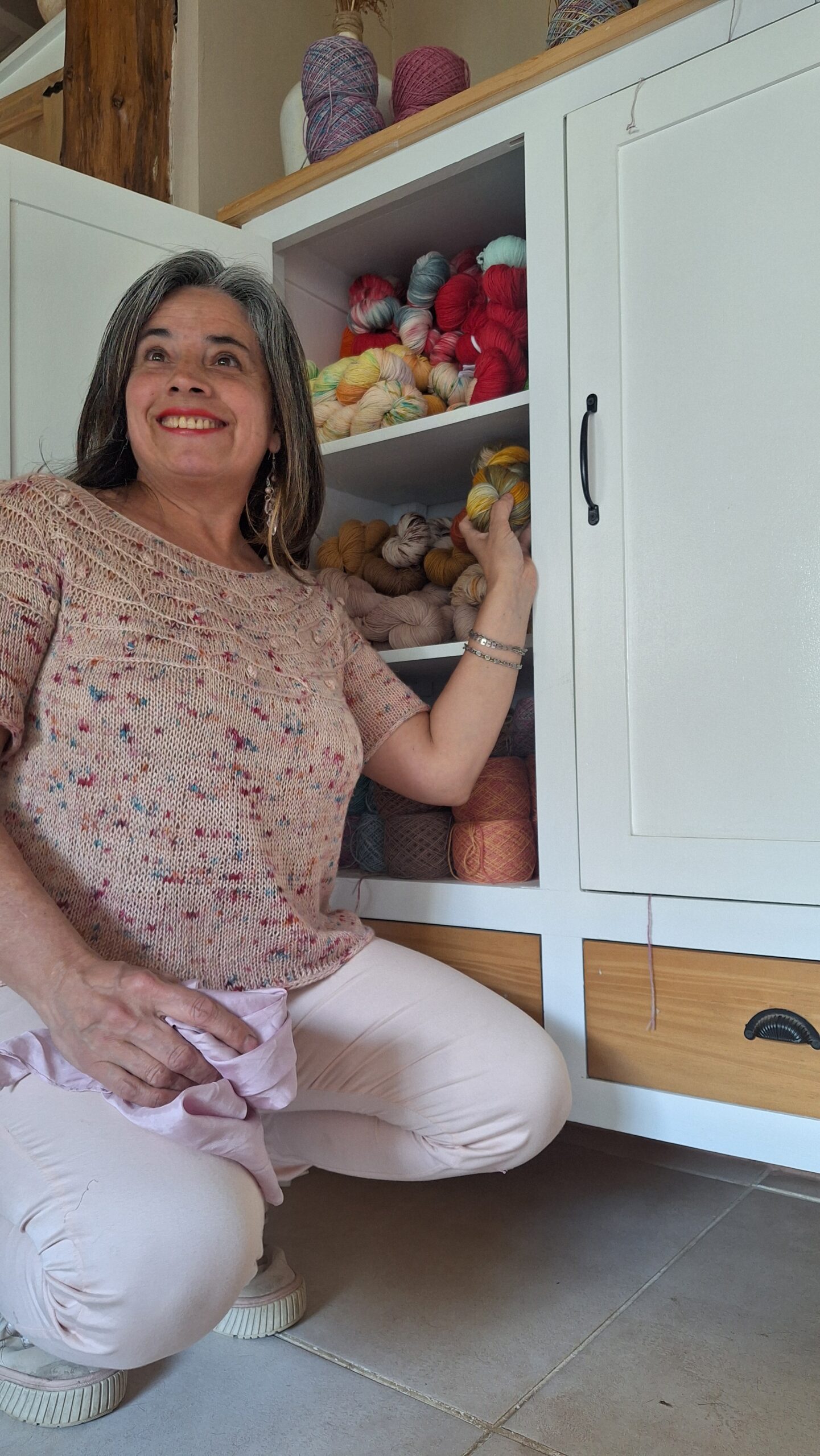 Se teje con agujas circulares, hilado grosor fingering. Yo utilicé 230 grs (contorno de pecho 105 cm) de lino con bambú, que se agotó , pero puedes tejerlo con cualquier grosor fingering , hasta con Isa y la puedes tejer de entretiempo